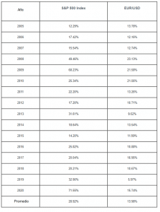 En esta tabla puedes encontrar cómo han cambiado los movimientos porcentuales Forex vs acciones